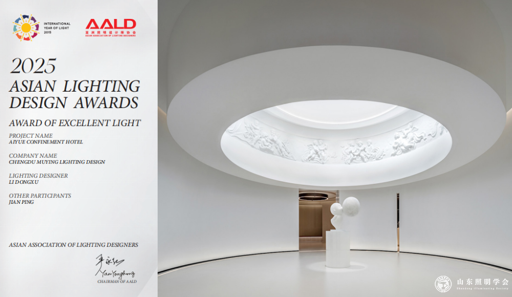 在2025年第十届亚洲照明设计奖中,爱悦月子时光店项目获得“优异之光” ,并在“2025年第20届灯光之夜暨亚洲照明设计奖颁奖典礼”上获授奖项。