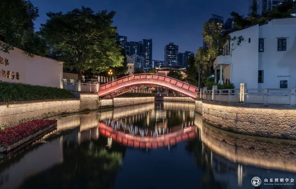 滨河段是照明设计的重点区域。灯光重点勾画拱形桥底,整体泛亮而不照亮其他部位,与水面倒影形成"月牙桥",在呈现造型之美的同时,勾勒出闲情逸致之境。