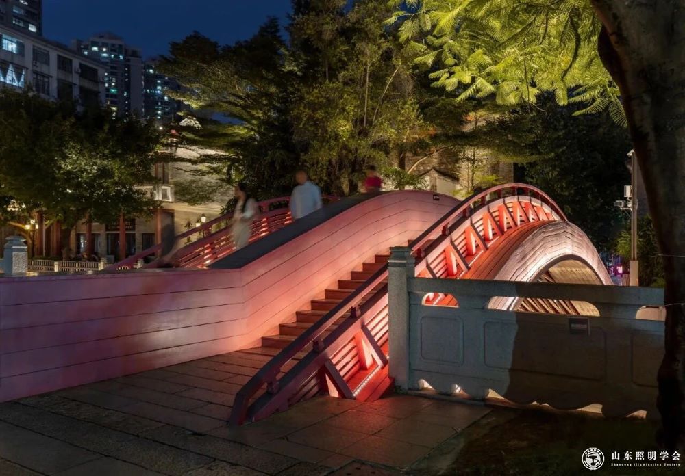 标志着IP符号的"红桥"成为视觉焦点,灯光重点渲染主体色彩及一体性,使其成为夜间浓烈的一抹红。采用3000K色温的灯具,既突出了红桥本身的色彩,又完美融入整体环境。