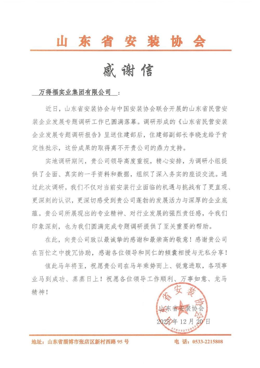 另外,由山东省安装协会与中国安装协会联合开展的山东省民营安装企业发展专题调研已圆满落幕。万得福实业集团作为山东省安装行业的标杆企业、协会理事单位,受邀成为重点座谈交流企业,万得福实业集团以高度的专业精神与强烈的行业责任感,赢得了调研组的高度赞誉!