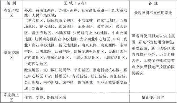 此外,《规划》还设置了彩光的严控区、控制区和禁止区,以及动态光的严控区、控制区和禁止区。其中,住宅、学校、医院等区域均禁止使用彩光和动态光。