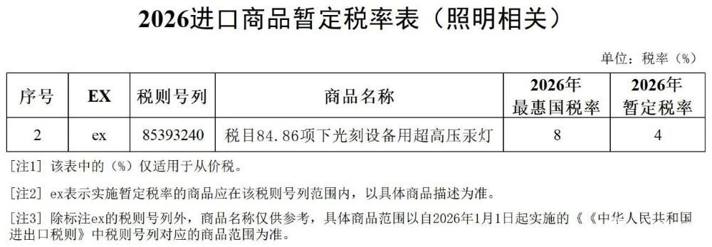自2026年1月1日起,“税目84.86项下光刻设备用超高压汞灯”继续实施进口暂定税率。该税率同2025年一致。