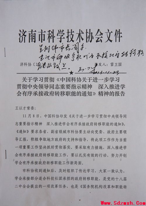 济南市委领导对推进学会有序承接政府转移职能做出重要批示