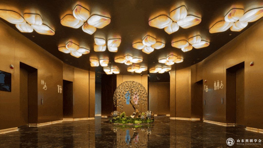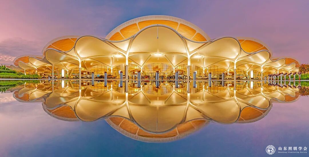 主楼由7个带型天窗的拱形构成,天窗下是白色穿孔铝板“滤光器”,让光线更为柔和,形态如饱满的稻穗,寓意丰收和圆满。“滤光器”由3.0毫米厚铝板激光切割而成,铝板局部压弯呈现立体形态,其艺术图案透光孔以及敷设的真彩线条灯,结合4种不同木纹错缝拼色花瓣天花吊顶,让航站楼在白天和夜晚都独具风采。