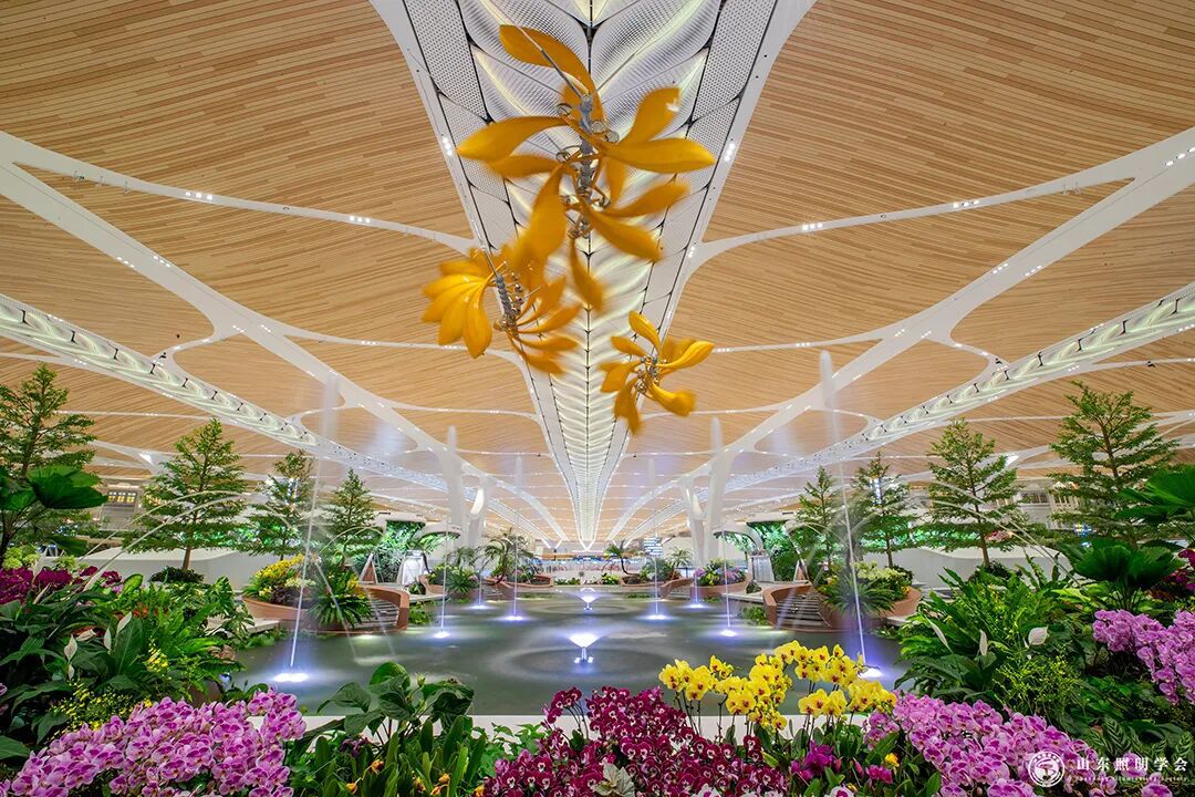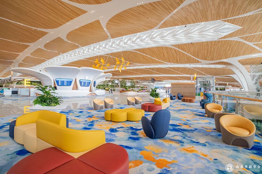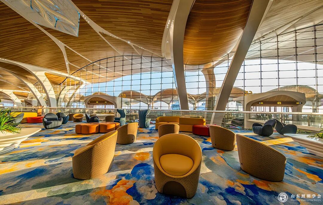 作为国内目前规模最大的暖色仿木纹吊顶航站楼,主色调是“金穗黄”,加上香槟色墙面及暖色灯光,结合7种图案的地毯、特色座椅及各类人性化服务设施的应用,营造出色彩斑斓、温馨愉悦、精品酒店式的空间氛围。