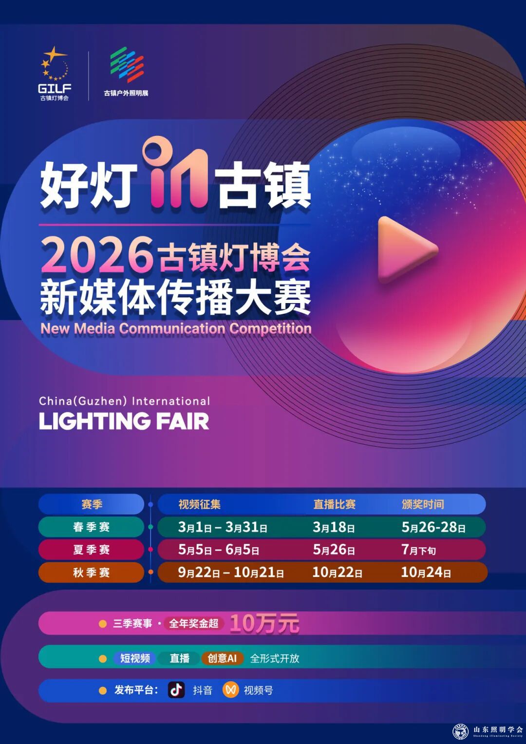 “好灯in古镇”2026古镇灯博会新媒体传播大赛全面升级,打造贯穿春、夏、秋三届展会的年度赛事。大赛将于3月正式启动,于10月举办首轮颁奖,按季度设置多项人气奖项。